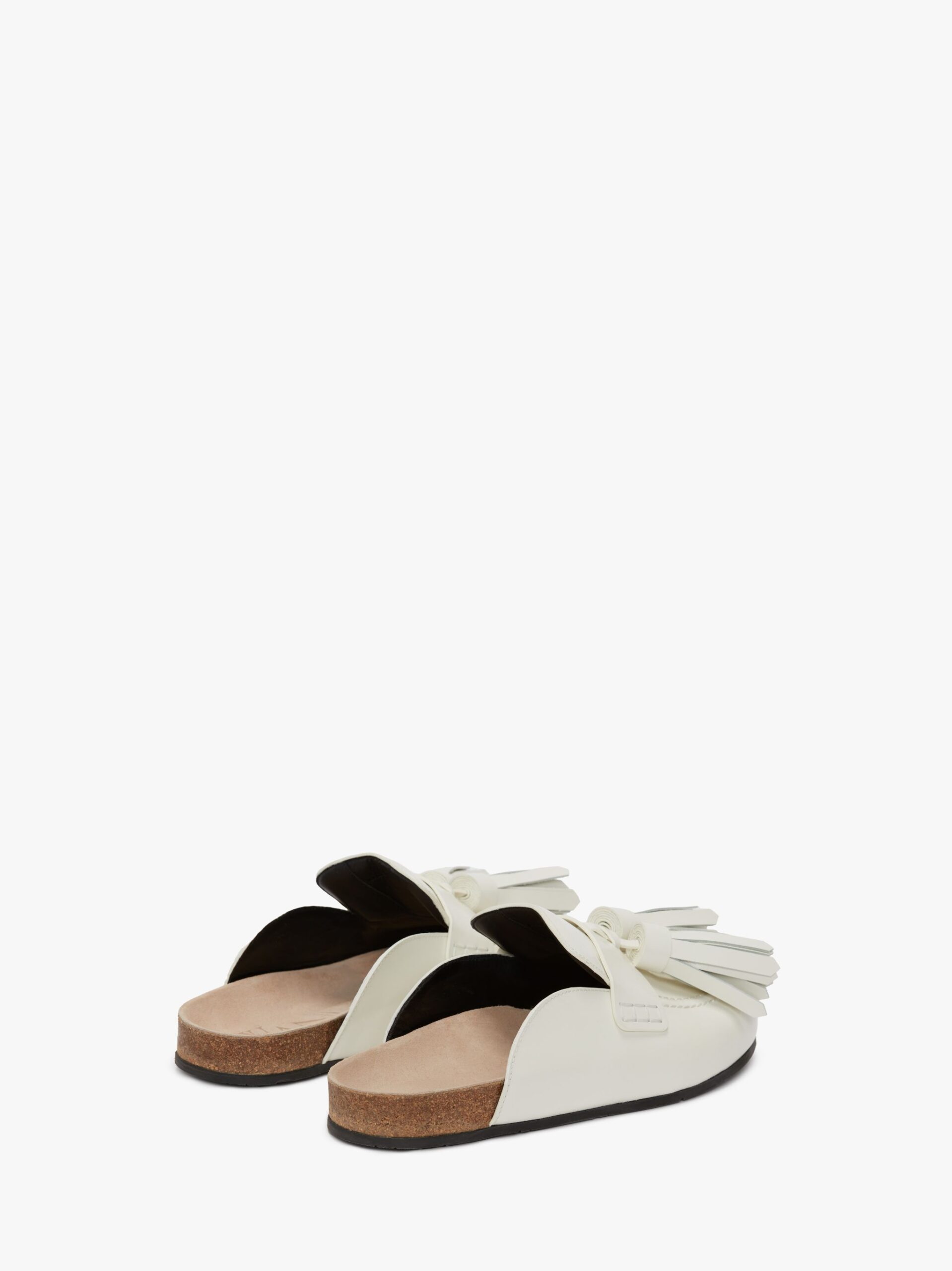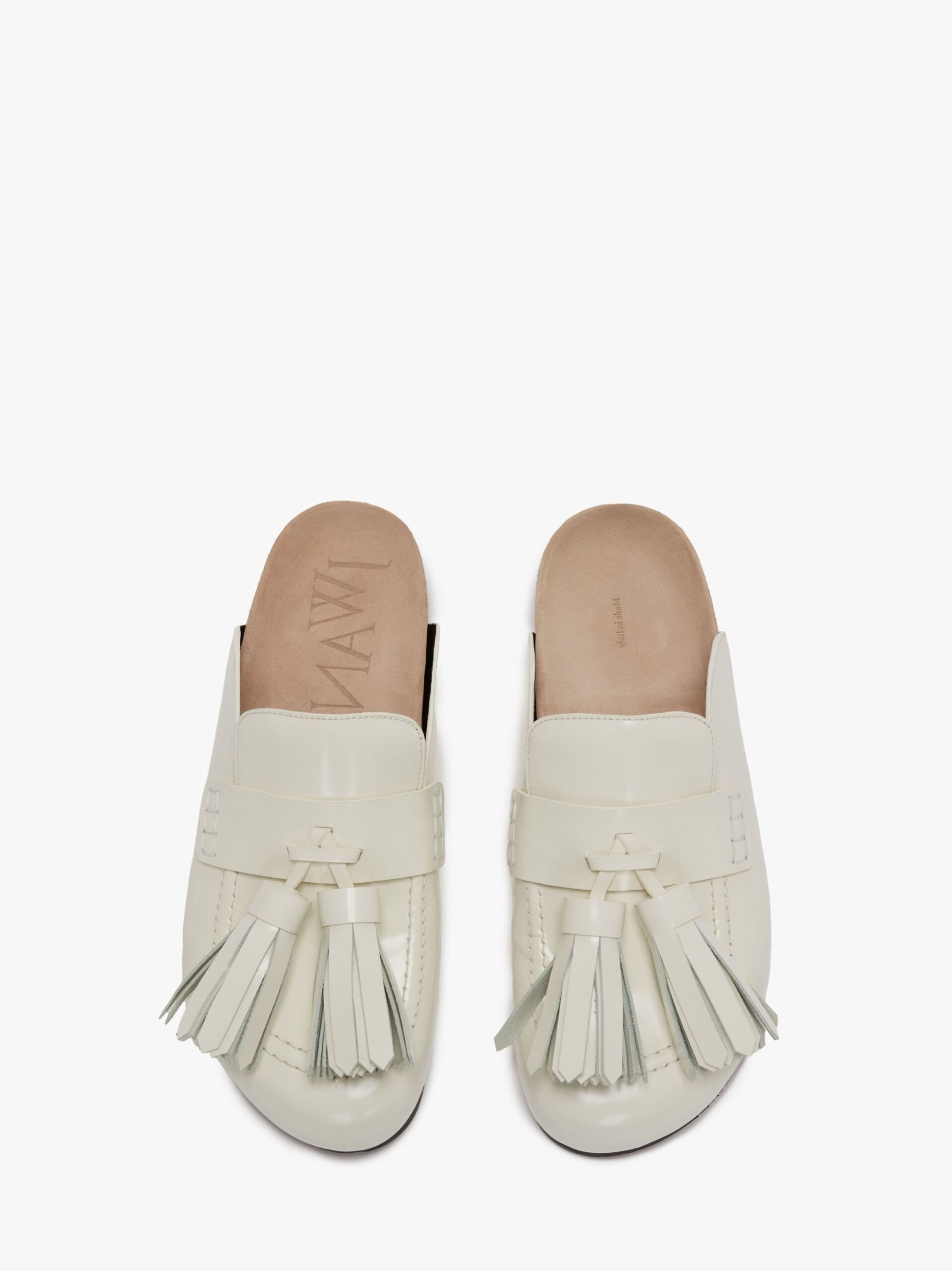 Leather loafer mules with exaggerated tassels in white color.